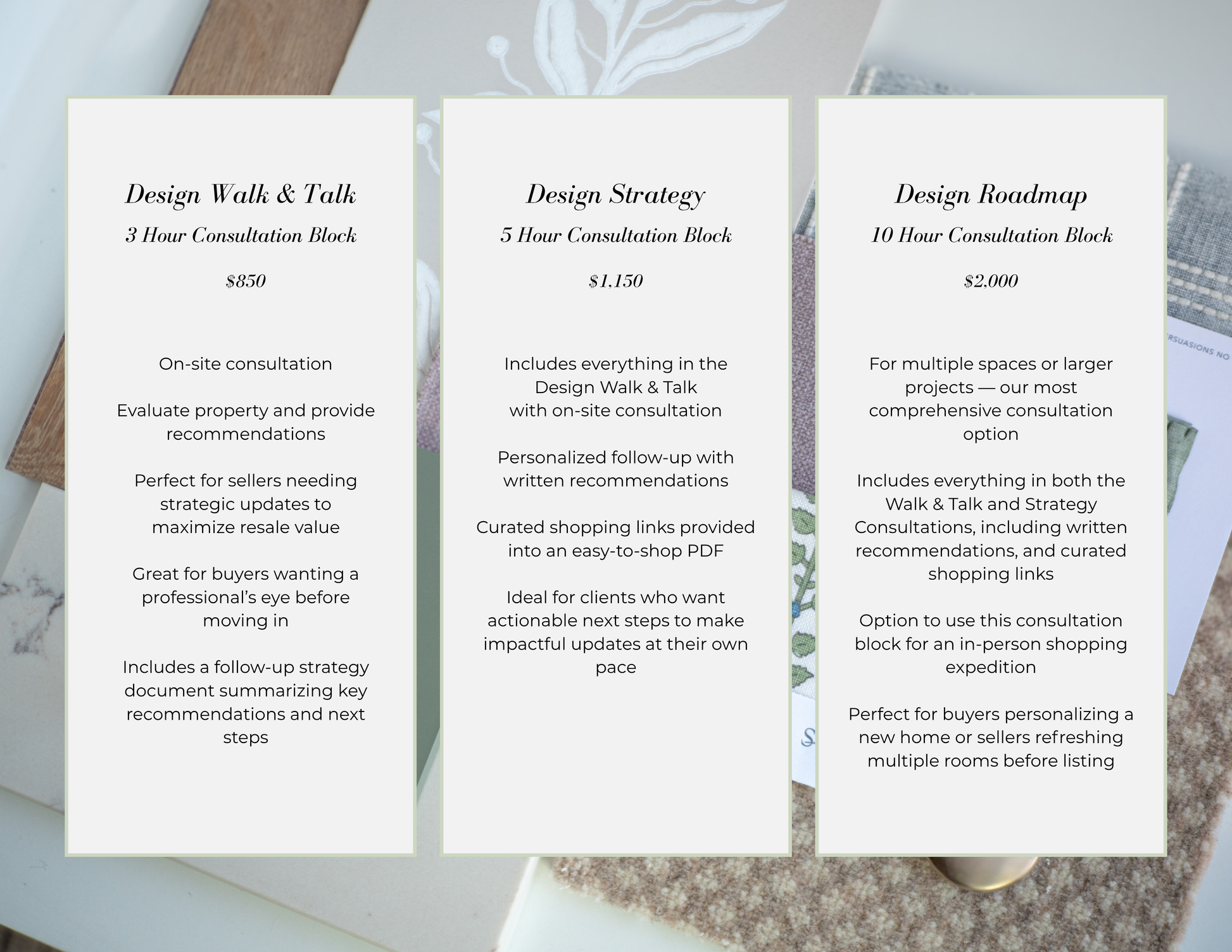 The purchase of a time block covers the hours specified in the selected package. Any additional design services outside the purchased time block, including a la carte services or follow-up consultations, require an additional time block.
