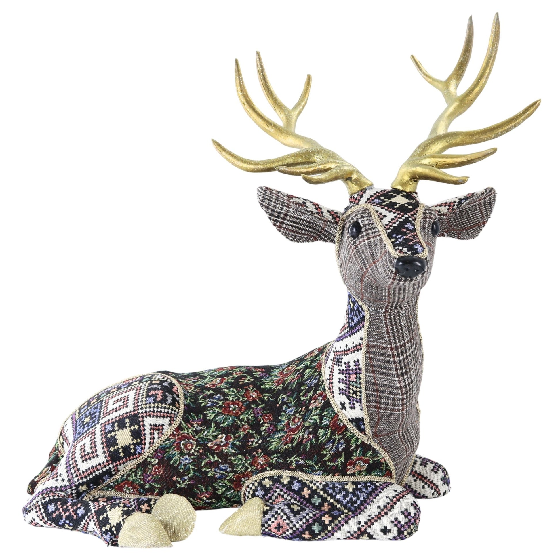 This unique Vintage Floral Fabric Deer brings an elegant, timeless look to any home. Its gorgeous fabric has a soft, vintage floral pattern that gives this special piece a charming look. Crafted with gold antlers for a luxurious touch, this oversized deer decoration will add a luxurious touch to any space. Availble in 2 textile patterns, in 4 styles.